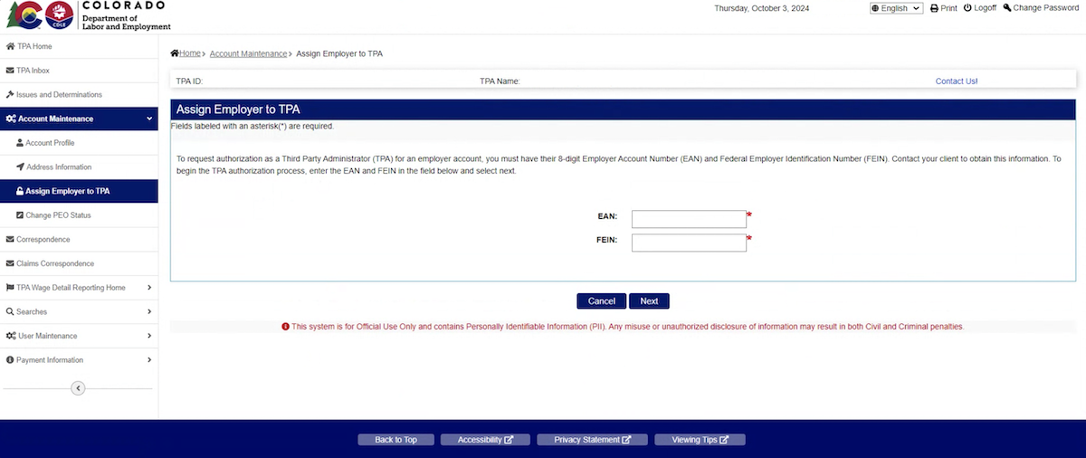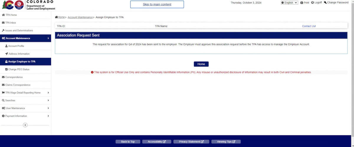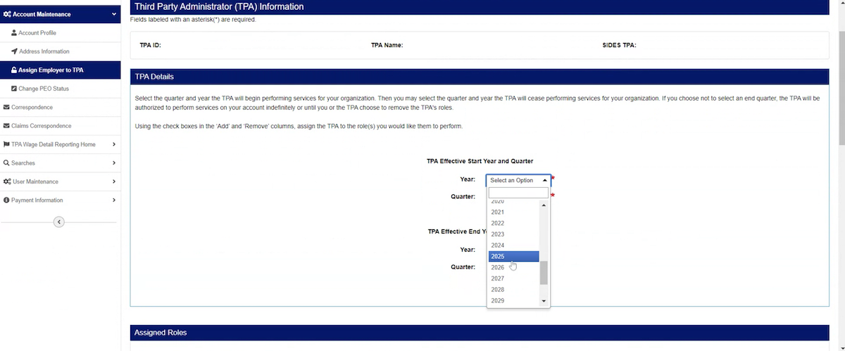 TPAs may also select an “Effective End Year and Quarter” when the TPA’s access to the employer account will end. An Effective End Year and Quarter date is not required to initiate the association.
