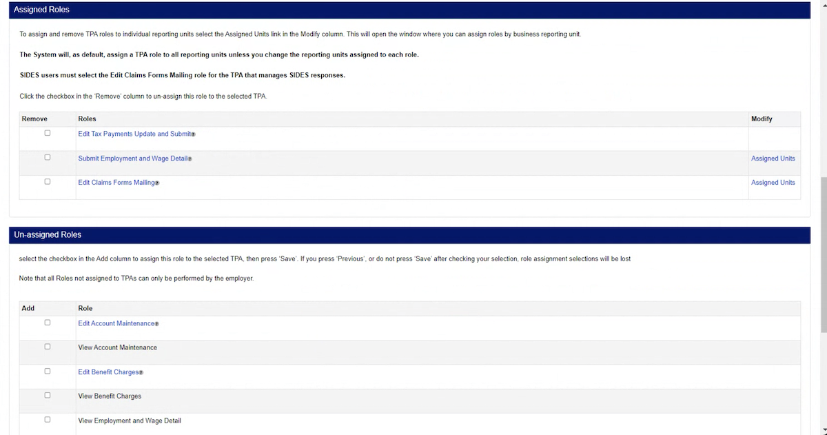 Once approved, the TPA can conduct Unemployment Insurance (UI) activities on the employer’s behalf based on their assigned roles. TPAs may also use this request process to modify existing relationships, account roles and permissions.