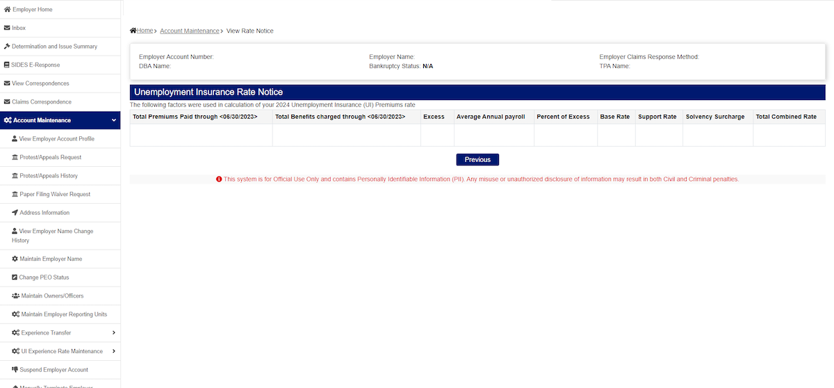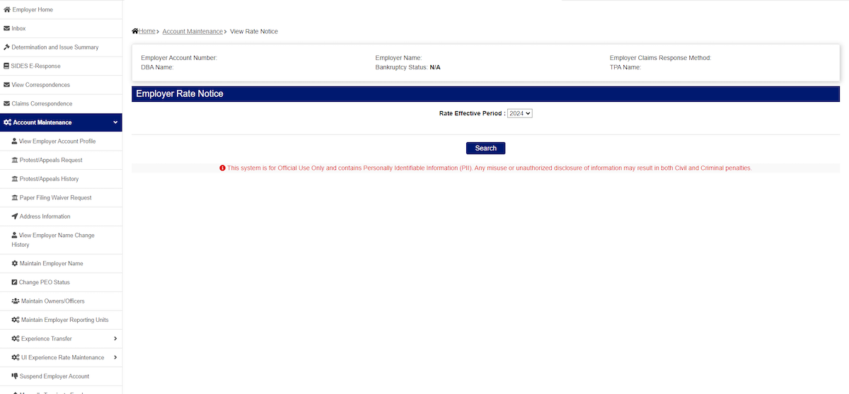 - View the UI Rate Notice for the selected year. Information provided includes: