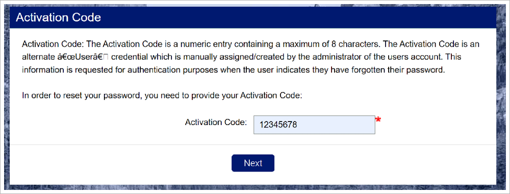 The Activation Code is an 8-digit numeric entry of your staff’s choosing. The Activation Code is an alternate "User" credential that is created by your employee during their password set up. This information is requested for authentication purposes when the user indicates they have forgotten their password.