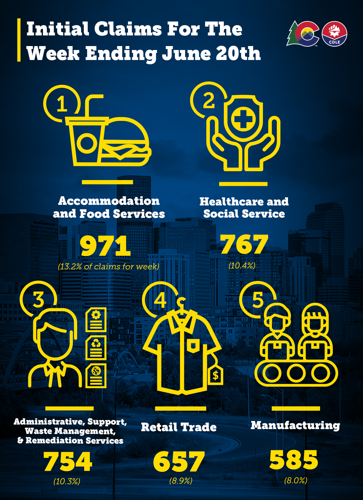 (DENVER) -- Today the Colorado Department of Labor and Employment (CDLE) reported that 7,854 regular initial unemployment claims were filed the week ending July 4th. There were also 5,900 Pandemic Unemployment Assistance (PUA) claims filed for the same week. Over the past 16 weeks, a total of 483,065 regular unemployment initial claims have been filed and a grand total of 617,481 claims, including federal PUA benefits.*